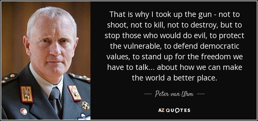 That is why I took up the gun - not to shoot, not to kill, not to destroy, but to stop those who would do evil, to protect the vulnerable, to defend democratic values, to stand up for the freedom we have to talk ... about how we can make the world a better place.