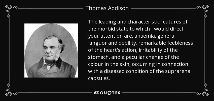 The leading and characteristic features of the morbid state to which I would direct your attention are, anaemia, general languor and debility, remarkable feebleness of the heart's action, irritability of the stomach, and a peculiar change of the colour in the skin, occurring in connection with a diseased condition of the suprarenal capsules.