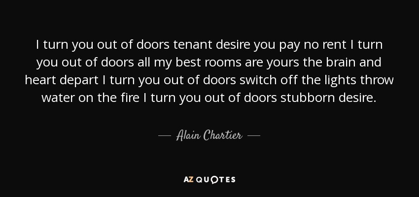 I turn you out of doors tenant desire you pay no rent I turn you out of doors all my best rooms are yours the brain and heart depart I turn you out of doors switch off the lights throw water on the fire I turn you out of doors stubborn desire.