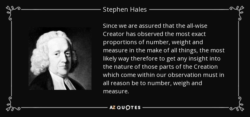 Since we are assured that the all-wise Creator has observed the most exact proportions of number, weight and measure in the make of all things, the most likely way therefore to get any insight into the nature of those parts of the Creation which come within our observation must in all reason be to number, weigh and measure.