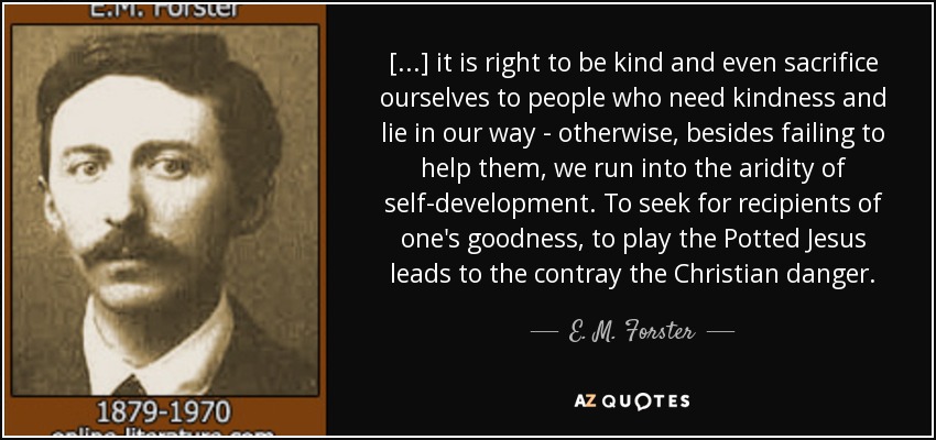 [...] it is right to be kind and even sacrifice ourselves to people who need kindness and lie in our way - otherwise, besides failing to help them, we run into the aridity of self-development. To seek for recipients of one's goodness, to play the Potted Jesus leads to the contray the Christian danger.