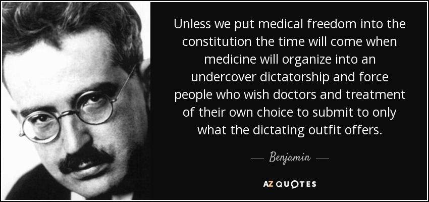 Unless we put medical freedom into the constitution the time will come when medicine will organize into an undercover dictatorship and force people who wish doctors and treatment of their own choice to submit to only what the dictating outfit offers.
