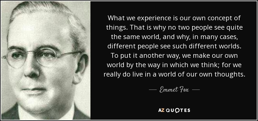 What we experience is our own concept of things. That is why no two people see quite the same world, and why, in many cases, different people see such different worlds. To put it another way, we make our own world by the way in which we think; for we really do live in a world of our own thoughts.