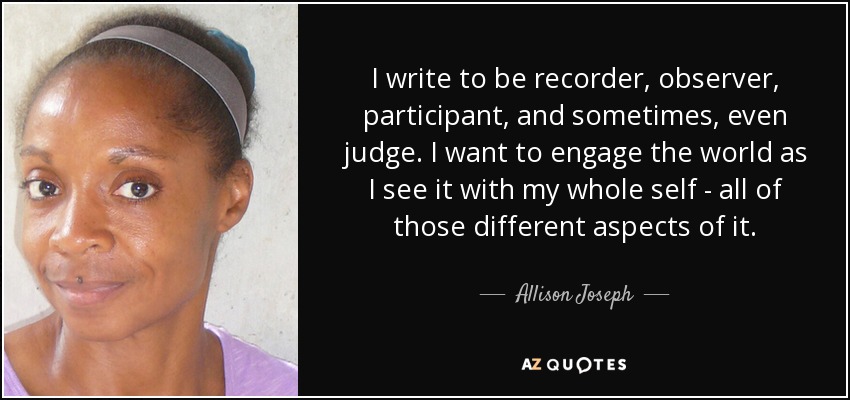 I write to be recorder, observer, participant, and sometimes, even judge. I want to engage the world as I see it with my whole self - all of those different aspects of it.