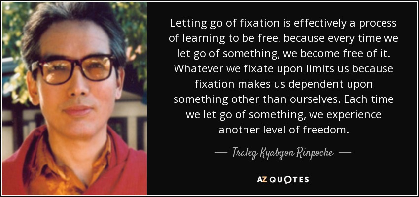 Letting go of fixation is effectively a process of learning to be free, because every time we let go of something, we become free of it. Whatever we fixate upon limits us because fixation makes us dependent upon something other than ourselves. Each time we let go of something, we experience another level of freedom.