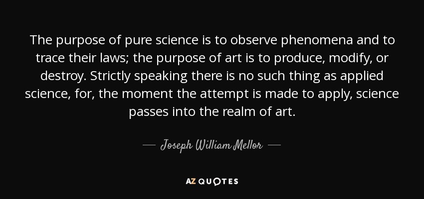 The purpose of pure science is to observe phenomena and to trace their laws; the purpose of art is to produce, modify, or destroy. Strictly speaking there is no such thing as applied science, for, the moment the attempt is made to apply, science passes into the realm of art.