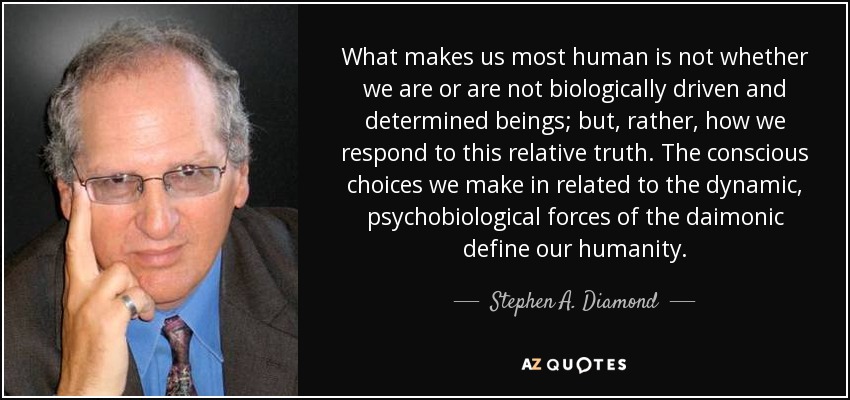 What makes us most human is not whether we are or are not biologically driven and determined beings; but, rather, how we respond to this relative truth. The conscious choices we make in related to the dynamic, psychobiological forces of the daimonic define our humanity.