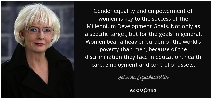 Gender equality and empowerment of women is key to the success of the Millennium Development Goals. Not only as a specific target, but for the goals in general. Women bear a heavier burden of the world's poverty than men, because of the discrimination they face in education, health care, employment and control of assets.