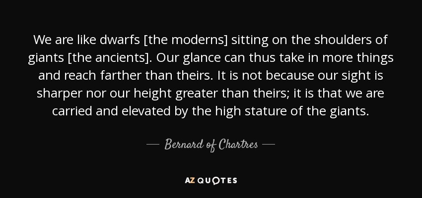We are like dwarfs [the moderns] sitting on the shoulders of giants [the ancients]. Our glance can thus take in more things and reach farther than theirs. It is not because our sight is sharper nor our height greater than theirs; it is that we are carried and elevated by the high stature of the giants.