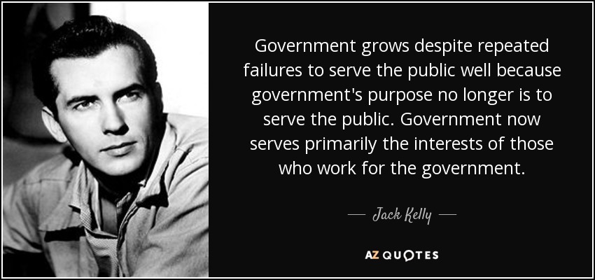 Government grows despite repeated failures to serve the public well because government's purpose no longer is to serve the public. Government now serves primarily the interests of those who work for the government.