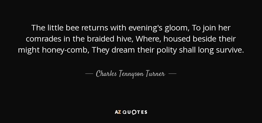 The little bee returns with evening's gloom, To join her comrades in the braided hive, Where, housed beside their might honey-comb, They dream their polity shall long survive.