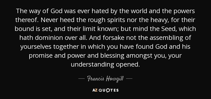 The way of God was ever hated by the world and the powers thereof. Never heed the rough spirits nor the heavy, for their bound is set, and their limit known; but mind the Seed, which hath dominion over all. And forsake not the assembling of yourselves together in which you have found God and his promise and power and blessing amongst you, your understanding opened.