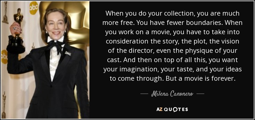 When you do your collection, you are much more free. You have fewer boundaries. When you work on a movie, you have to take into consideration the story, the plot, the vision of the director, even the physique of your cast. And then on top of all this, you want your imagination, your taste, and your ideas to come through. But a movie is forever.