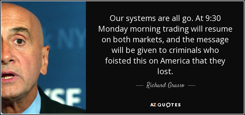 Our systems are all go. At 9:30 Monday morning trading will resume on both markets, and the message will be given to criminals who foisted this on America that they lost.