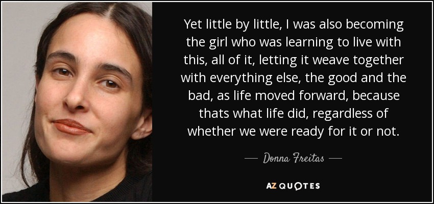 Yet little by little, I was also becoming the girl who was learning to live with this, all of it, letting it weave together with everything else, the good and the bad, as life moved forward, because thats what life did, regardless of whether we were ready for it or not.