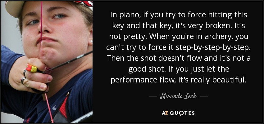In piano, if you try to force hitting this key and that key, it's very broken. It's not pretty. When you're in archery, you can't try to force it step-by-step-by-step. Then the shot doesn't flow and it's not a good shot. If you just let the performance flow, it's really beautiful.