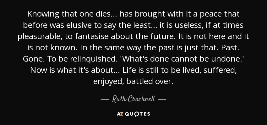 Knowing that one dies... has brought with it a peace that before was elusive to say the least... it is useless, if at times pleasurable, to fantasise about the future. It is not here and it is not known. In the same way the past is just that. Past. Gone. To be relinquished. 'What's done cannot be undone.' Now is what it's about... Life is still to be lived, suffered, enjoyed, battled over.