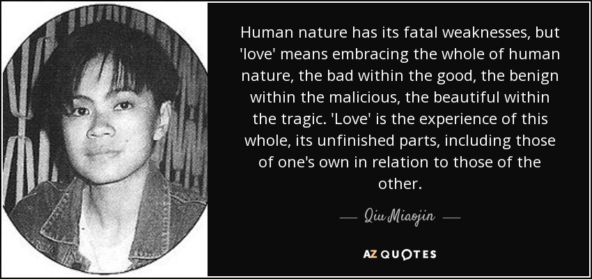 Human nature has its fatal weaknesses, but 'love' means embracing the whole of human nature, the bad within the good, the benign within the malicious, the beautiful within the tragic. 'Love' is the experience of this whole, its unfinished parts, including those of one's own in relation to those of the other.