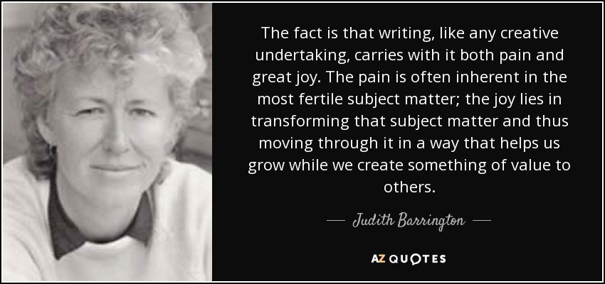 The fact is that writing, like any creative undertaking, carries with it both pain and great joy. The pain is often inherent in the most fertile subject matter; the joy lies in transforming that subject matter and thus moving through it in a way that helps us grow while we create something of value to others.