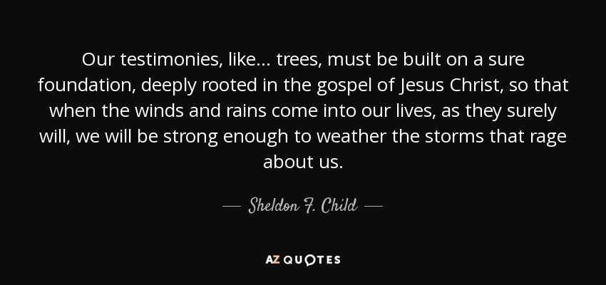 Our testimonies, like . . . trees, must be built on a sure foundation, deeply rooted in the gospel of Jesus Christ, so that when the winds and rains come into our lives, as they surely will, we will be strong enough to weather the storms that rage about us.