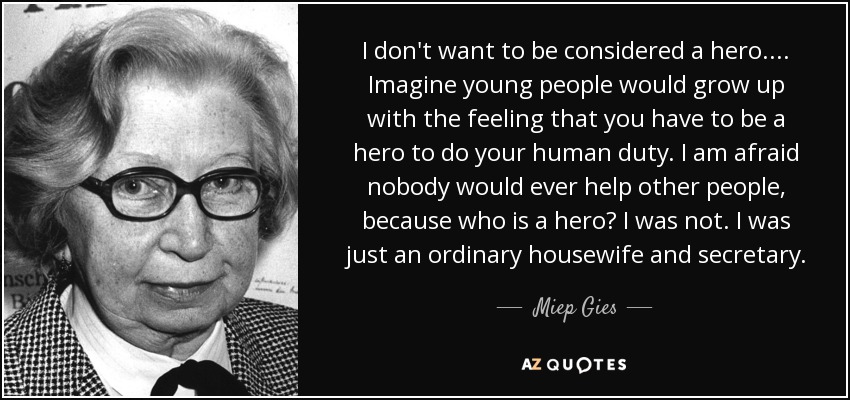 I don't want to be considered a hero.... Imagine young people would grow up with the feeling that you have to be a hero to do your human duty. I am afraid nobody would ever help other people, because who is a hero? I was not. I was just an ordinary housewife and secretary.