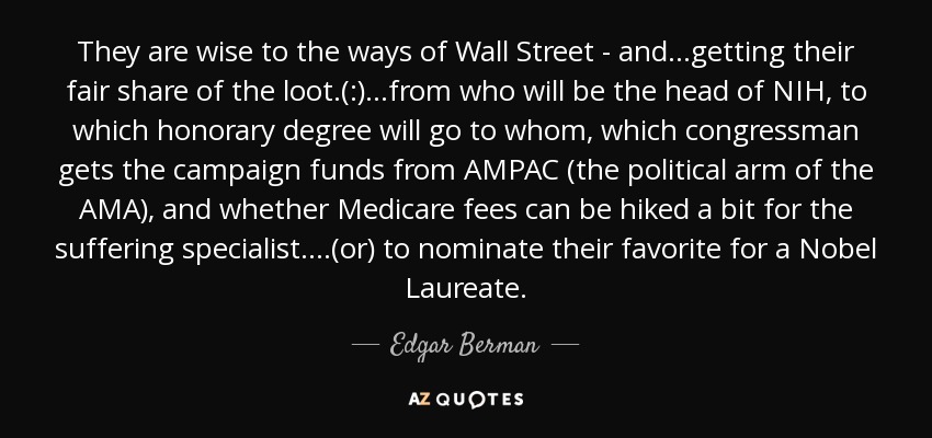 They are wise to the ways of Wall Street - and...getting their fair share of the loot.(:)...from who will be the head of NIH, to which honorary degree will go to whom, which congressman gets the campaign funds from AMPAC (the political arm of the AMA), and whether Medicare fees can be hiked a bit for the suffering specialist. ...(or) to nominate their favorite for a Nobel Laureate.