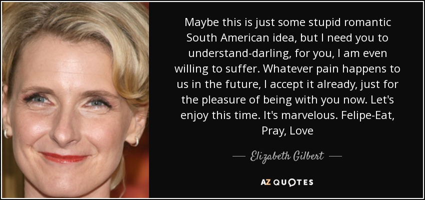 Maybe this is just some stupid romantic South American idea, but I need you to understand-darling, for you, I am even willing to suffer. Whatever pain happens to us in the future, I accept it already, just for the pleasure of being with you now. Let's enjoy this time. It's marvelous. Felipe-Eat, Pray, Love