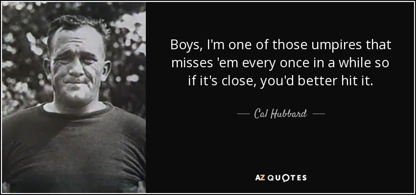 Boys, I'm one of those umpires that misses 'em every once in a while so if it's close, you'd better hit it.