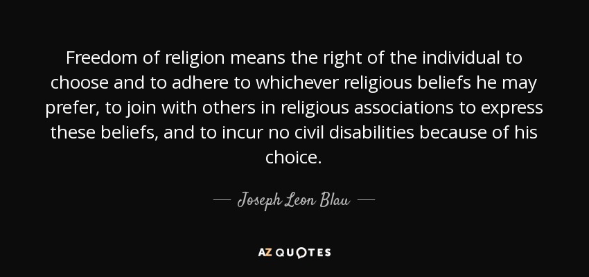 Freedom of religion means the right of the individual to choose and to adhere to whichever religious beliefs he may prefer, to join with others in religious associations to express these beliefs, and to incur no civil disabilities because of his choice.