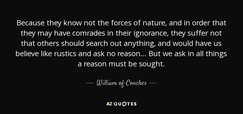 Because they know not the forces of nature, and in order that they may have comrades in their ignorance, they suffer not that others should search out anything, and would have us believe like rustics and ask no reason... But we ask in all things a reason must be sought.