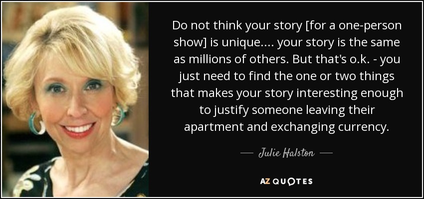 Do not think your story [for a one-person show] is unique. . . . your story is the same as millions of others. But that's o.k. - you just need to find the one or two things that makes your story interesting enough to justify someone leaving their apartment and exchanging currency.