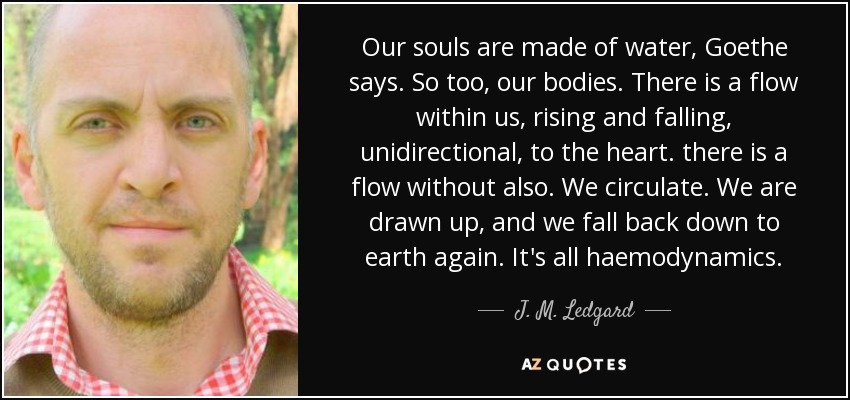 Our souls are made of water, Goethe says. So too, our bodies. There is a flow within us, rising and falling, unidirectional, to the heart. there is a flow without also. We circulate. We are drawn up, and we fall back down to earth again. It's all haemodynamics.