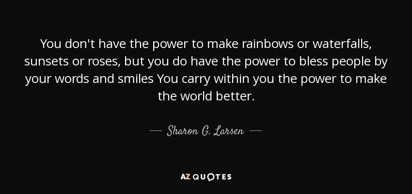 You don't have the power to make rainbows or waterfalls, sunsets or roses, but you do have the power to bless people by your words and smiles You carry within you the power to make the world better.