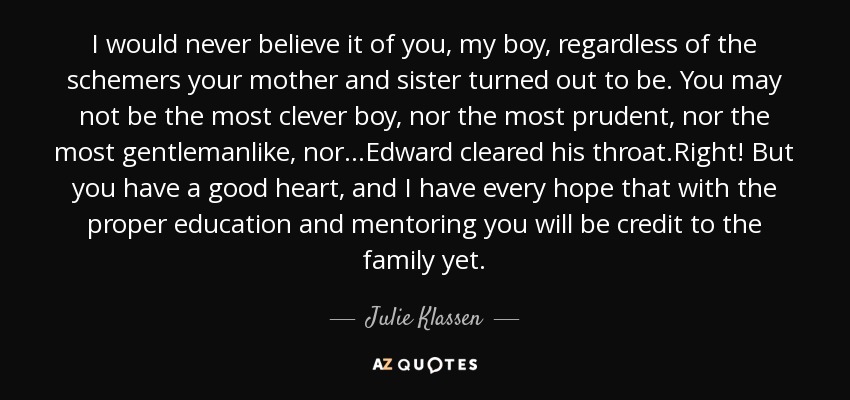I would never believe it of you, my boy, regardless of the schemers your mother and sister turned out to be. You may not be the most clever boy, nor the most prudent, nor the most gentlemanlike, nor...Edward cleared his throat.Right! But you have a good heart, and I have every hope that with the proper education and mentoring you will be credit to the family yet.