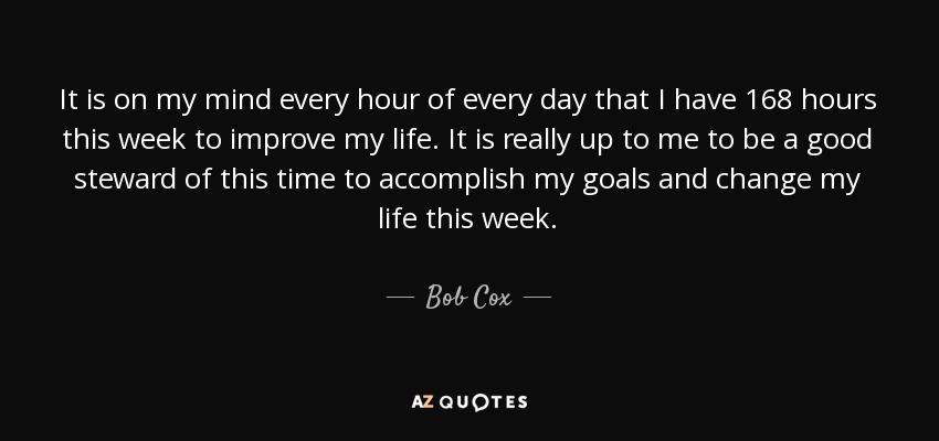 It is on my mind every hour of every day that I have 168 hours this week to improve my life. It is really up to me to be a good steward of this time to accomplish my goals and change my life this week.