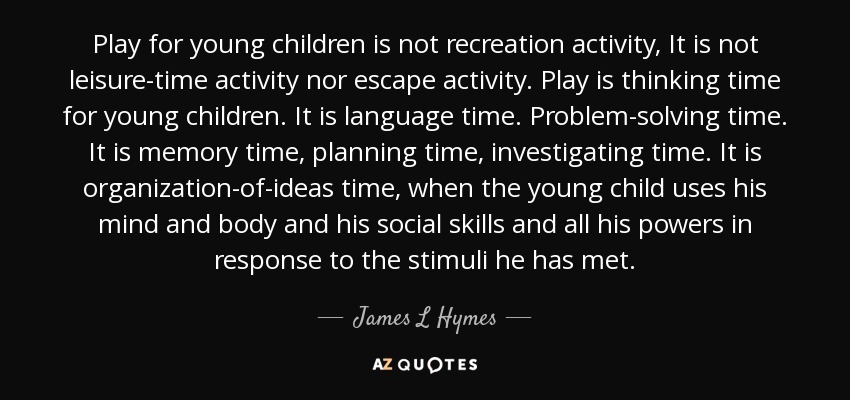 Play for young children is not recreation activity, It is not leisure-time activity nor escape activity. Play is thinking time for young children. It is language time. Problem-solving time. It is memory time, planning time, investigating time. It is organization-of-ideas time, when the young child uses his mind and body and his social skills and all his powers in response to the stimuli he has met.