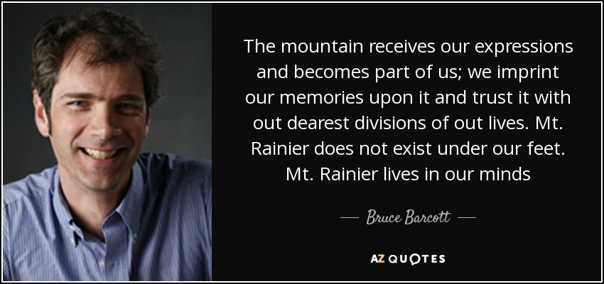 The mountain receives our expressions and becomes part of us; we imprint our memories upon it and trust it with out dearest divisions of out lives. Mt. Rainier does not exist under our feet. Mt. Rainier lives in our minds