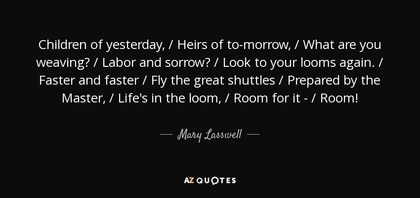 Children of yesterday, / Heirs of to-morrow, / What are you weaving? / Labor and sorrow? / Look to your looms again. / Faster and faster / Fly the great shuttles / Prepared by the Master, / Life's in the loom, / Room for it - / Room!