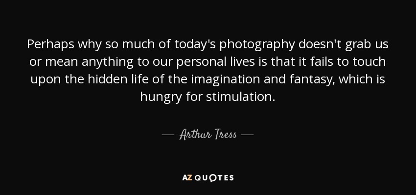 Perhaps why so much of today's photography doesn't grab us or mean anything to our personal lives is that it fails to touch upon the hidden life of the imagination and fantasy, which is hungry for stimulation.