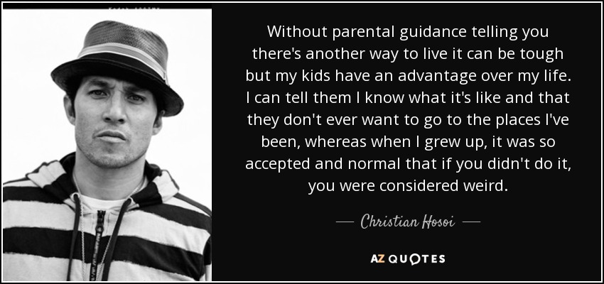 Without parental guidance telling you there's another way to live it can be tough but my kids have an advantage over my life. I can tell them I know what it's like and that they don't ever want to go to the places I've been, whereas when I grew up, it was so accepted and normal that if you didn't do it, you were considered weird.