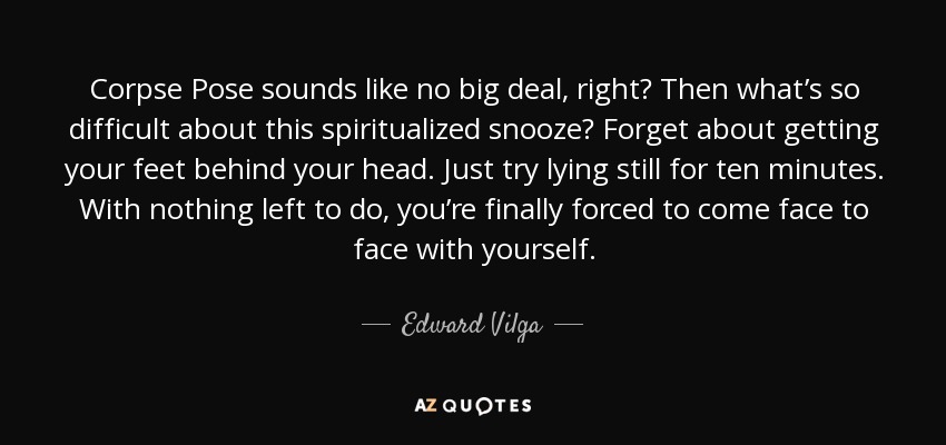 Corpse Pose sounds like no big deal, right? Then what’s so difficult about this spiritualized snooze? Forget about getting your feet behind your head. Just try lying still for ten minutes. With nothing left to do, you’re finally forced to come face to face with yourself.