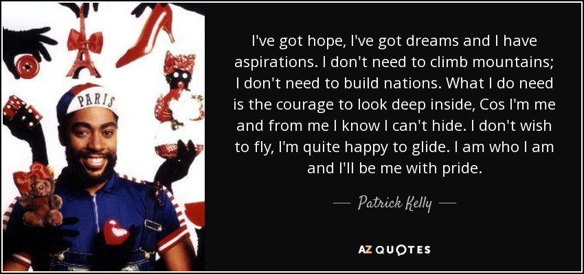 I've got hope, I've got dreams and I have aspirations. I don't need to climb mountains; I don't need to build nations. What I do need is the courage to look deep inside, Cos I'm me and from me I know I can't hide. I don't wish to fly, I'm quite happy to glide. I am who I am and I'll be me with pride.
