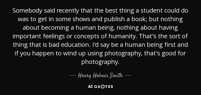 Somebody said recently that the best thing a student could do was to get in some shows and publish a book; but nothing about becoming a human being, nothing about having important feelings or concepts of humanity. That's the sort of thing that is bad education. I'd say be a human being first and if you happen to wind up using photography, that's good for photography.