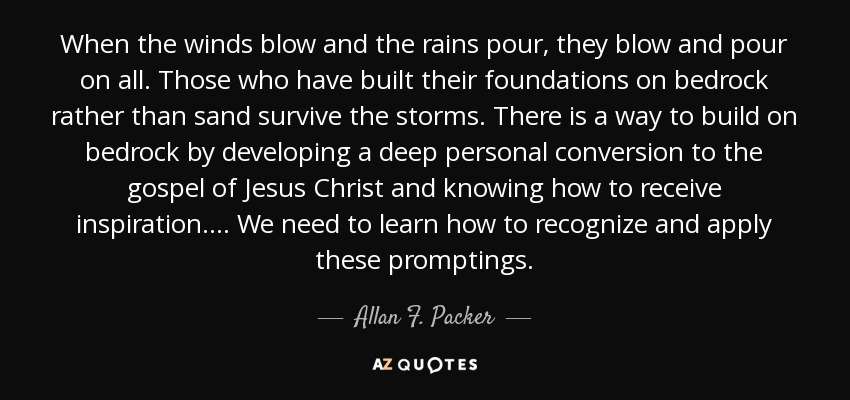 When the winds blow and the rains pour, they blow and pour on all. Those who have built their foundations on bedrock rather than sand survive the storms. There is a way to build on bedrock by developing a deep personal conversion to the gospel of Jesus Christ and knowing how to receive inspiration. . . . We need to learn how to recognize and apply these promptings.