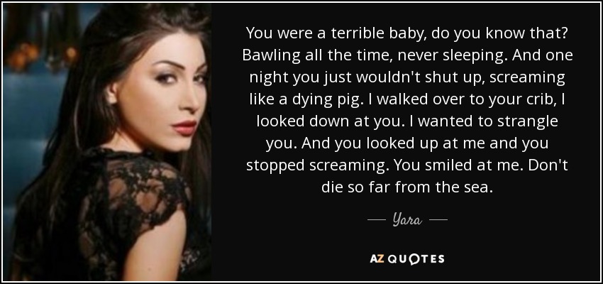 You were a terrible baby, do you know that? Bawling all the time, never sleeping. And one night you just wouldn't shut up, screaming like a dying pig. I walked over to your crib, I looked down at you. I wanted to strangle you. And you looked up at me and you stopped screaming. You smiled at me. Don't die so far from the sea.