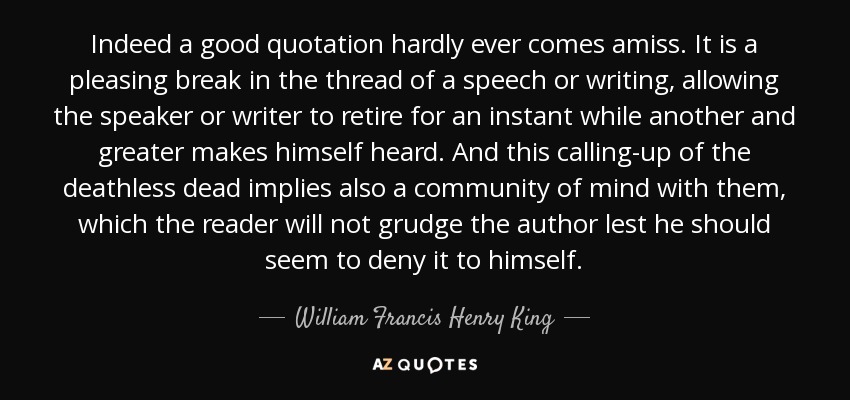 Indeed a good quotation hardly ever comes amiss. It is a pleasing break in the thread of a speech or writing, allowing the speaker or writer to retire for an instant while another and greater makes himself heard. And this calling-up of the deathless dead implies also a community of mind with them, which the reader will not grudge the author lest he should seem to deny it to himself.