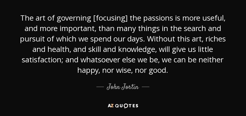 The art of governing [focusing] the passions is more useful, and more important, than many things in the search and pursuit of which we spend our days. Without this art, riches and health, and skill and knowledge, will give us little satisfaction; and whatsoever else we be, we can be neither happy, nor wise, nor good.