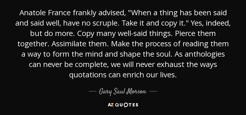 Anatole France frankly advised, "When a thing has been said and said well, have no scruple. Take it and copy it." Yes, indeed, but do more. Copy many well-said things. Pierce them together. Assimilate them. Make the process of reading them a way to form the mind and shape the soul. As anthologies can never be complete, we will never exhaust the ways quotations can enrich our lives.
