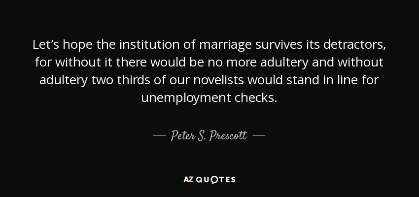 Let’s hope the institution of marriage survives its detractors, for without it there would be no more adultery and without adultery two thirds of our novelists would stand in line for unemployment checks.