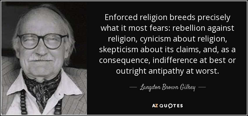Enforced religion breeds precisely what it most fears: rebellion against religion, cynicism about religion, skepticism about its claims, and, as a consequence, indifference at best or outright antipathy at worst.